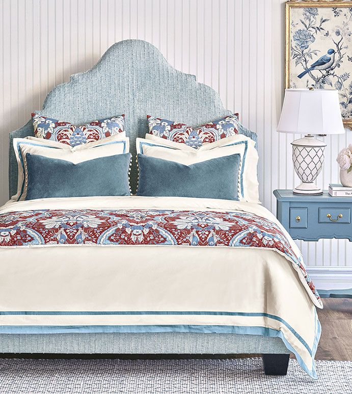 新英格兰的夏日激发了迷人的亲肤系列。来自意大利顶级时装工厂的锦缎图案,印在100%有机埃及棉的缎纹面料上,呈现出清爽的蓝色和浓艳的深红色。蓝色缎带装饰边的被套,营造出简约经典的美感。