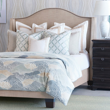 一次海滨之行,将浪花融入设计灵感。用海洋的深邃和浮沉引导温馨的夜晚,凉爽而舒缓的海洋印花让空间亦静亦动,水绿色的刺绣几何花纹和亚麻色边框,仿佛为浪漫注入龙骨,在梦里扬帆远航。
